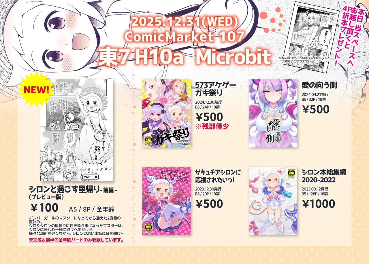2025.12.28(12/30更新)C107お品書き2025年12月31日(水)東京ビッグサイトにて開催の『コミックマーケット107』お品書きです。 新刊はシロン里帰りプレビュー本となります。 また、当日スペースにお越し頂いた方へマ…